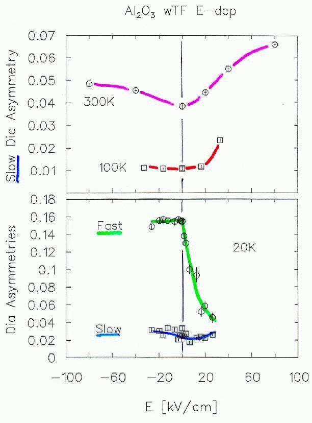 This was the picture until late 1997, when the electric field dependence of delayed Mu formation was studied in sapphire at low temperature (20K) where both the Fast and Slow relaxing diamagnetic components can be observed independently. As expected, the Slow component is essentially unaffected by E; but the Fast component has a dramatic E-dependence exactly opposite to that of slow-relaxing component at high temperature. If you can figure out why, please drop me a line!