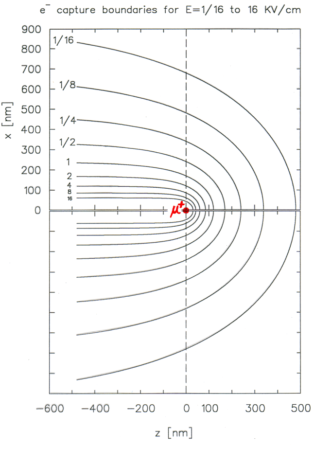 This figure shows a cross-sectional view of the spatial regions within which a radiolysis electron will be captured by a positive muon (due to its Coulomb attraction) for different magnitides of electric field strength Eext applied along the z axis. Outside that boundary the electron will be pulled away by Eext.