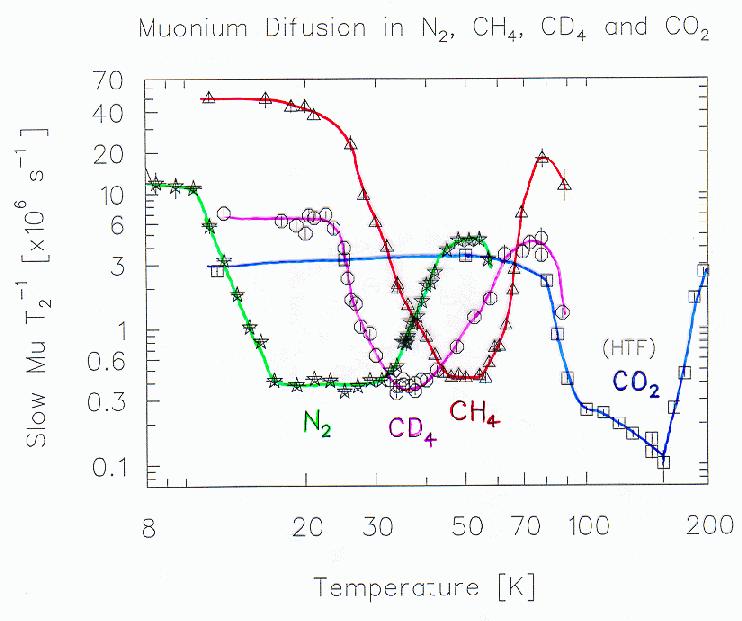 T-dep of Mu T2 in cxtls with Orientational Order: N2, CH4, CD4, CO2