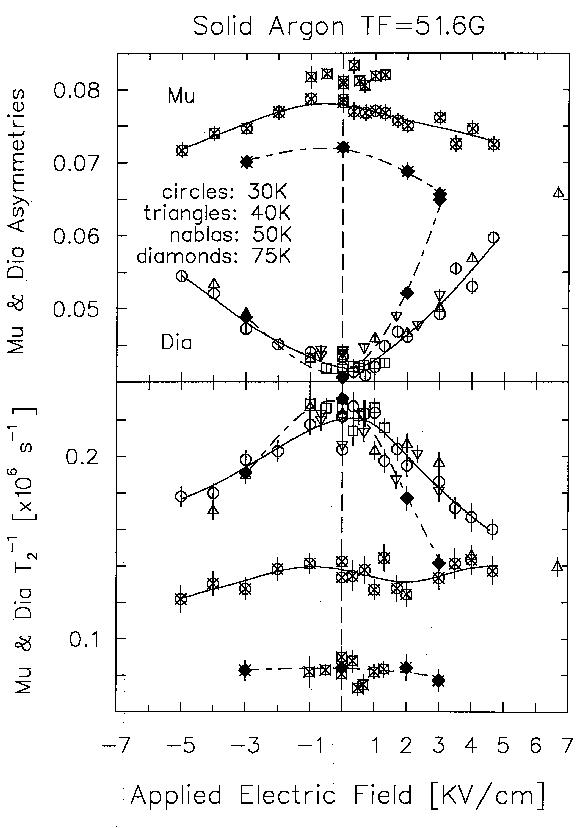 E-dep of Mu and Dia Asymm and Rlx rates in s-Ar at verious T