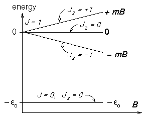 The so-called BREIT-RABI DIAGRAM shown above illustrates this magnetic field dependence of the energy levels. [In reality the Jz = 0 states curve up and down in strong fields and the singlet-triplet energy difference is much larger than shown in this illustration; but this picture is qualitatively correct in the limit of low magnetic fields.]